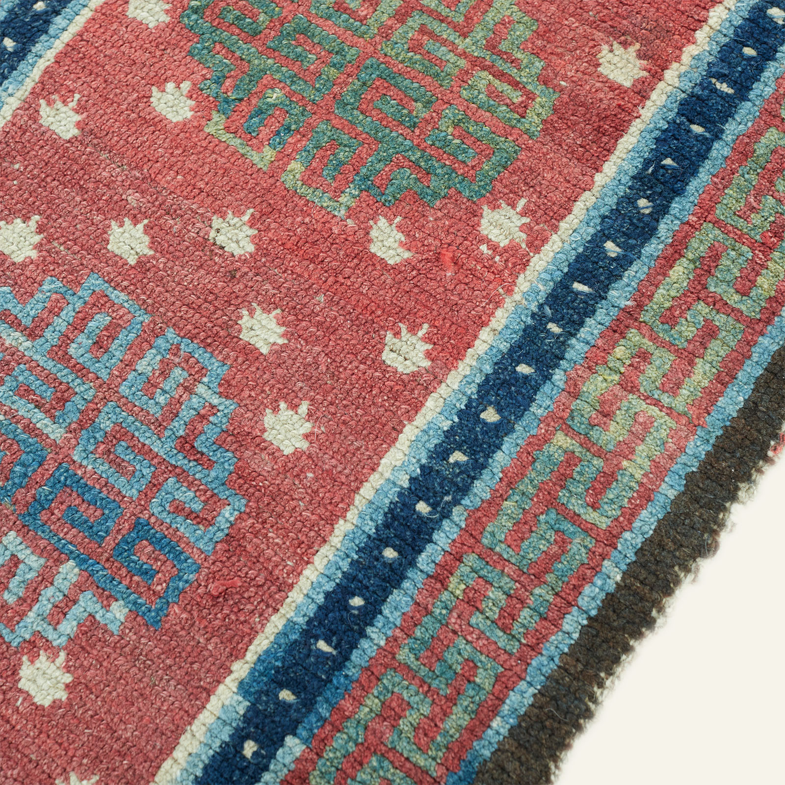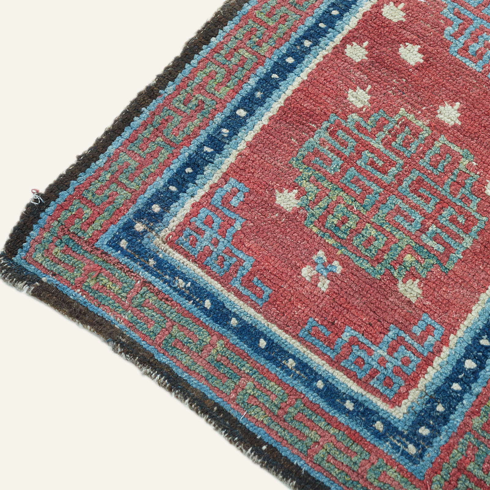 Intricately hand-crafted from luxurious 100% wool and adorned with a frog print and intricate medallion details, this exquisite ANTIQUE TIBETAN RUNNER is a masterpiece of Tibetan hand-knotting. Its meandering design and good condition add to its remarkable charm, making it a must-have for connoisseurs of fine rugs.