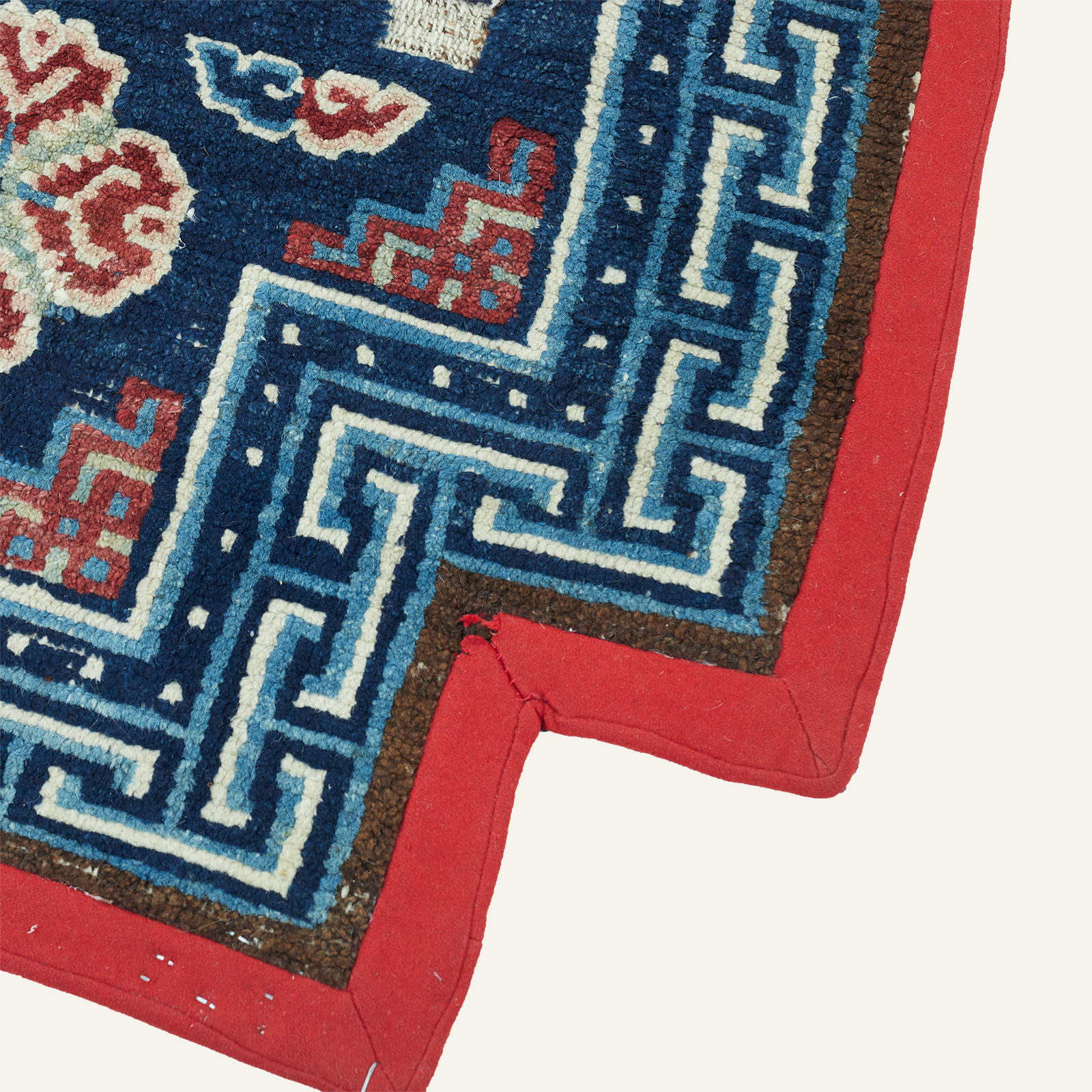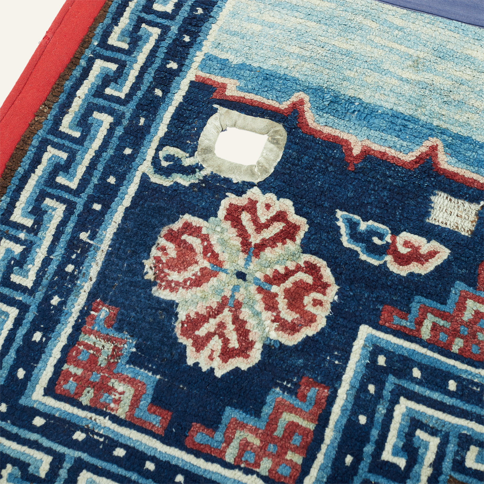 This exquisite ANTIQUE TIBETAN SADDLE RUG is adorned with intricate floral medallions, wispy clouds, and boundless knots, evoking a timeless elegance. Its meandering patterns and flawless craftsmanship, hand-knotted in Tibet using 100% wool, make it a true work of art. In good condition considering its age, this rug is a testament to the quality and luxury of hand knotted, heirloom construction.